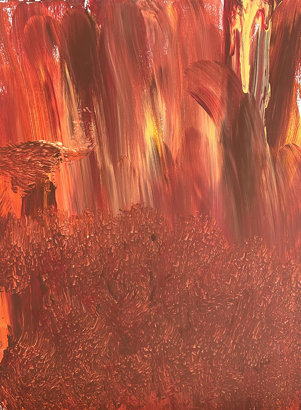 Sedona Sunrise — This painting depicts the beauty, tranquility, and serenity of Sedona’s natural landscape during the early hours when the sun rises and illuminates the red rocks in a stunning display of colors and light. I see reflections of red, yellow, and orange. Orange is such a warm color that gives off a healing energy, good fortune, and good vibes. I hope this painting gives the viewer the same effect.